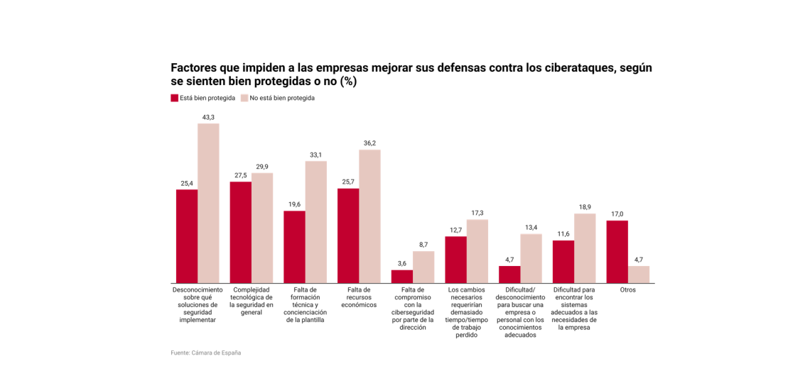 - Falta de conocimiento. Casi la mitad de las empresas (49,4%) ya contrata servicios de seguridad gestionada, pero más de un 30% reconoce que no sabe qué soluciones implementar y un 28,3% señala la complejidad tecnológica como freno.